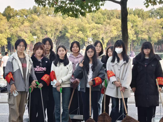 辅导员何茹梦现场带队,志愿者们统一佩戴袖标,在太阳成集团tyc122cc卫生区域进行分区包干、相互协作,仔细清理落叶、烟头和杂物,以实际行动践行志愿服务精神。