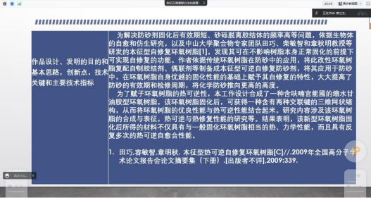 随后,蒙立生作为小组代表向大家展示了为解决防砂剂固化后有效期短、砂砾脱离胶结体的频率高等问题而做出的新型环氧树脂,可以极大解决如上问题。