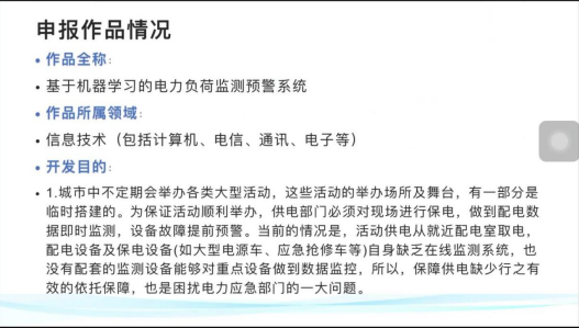 最后一组由周端漓进行汇报:“基于机器学习的电力负荷监测预警系统”,这个系统目的为了保障特殊场景的临时供电,提供行之有效的依托保障,能够解决电力应急部门的困扰。