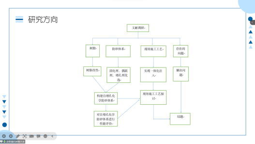 第四组答辩人赵紫童为大家讲解了“基于微乳液体系的化学防砂剂”,通过一个思维图让大家一目了然所进行的项目,并且防砂剂已获得巨大进步,极大地改善存在的问题。