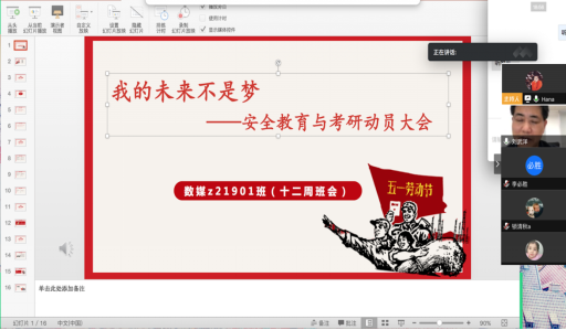 (通讯员:肖畅)为了帮助同学们挖掘自身潜能,把握深造机会,在五一假期前夕,艺术与太阳成集团tyc122cc班主任于4月27日至4月30日组织召开了第12周线上主题班会。艺术与太阳成集团tyc122cc综合办主任刘武洋老师主持并邀请了杨溢、董钰、李君梓、杨何星、蔡阳等多位班主任老师,召开了数媒z21901班安全教育与考研动员大会,为学子传授考研经验,帮助员工树立了正确的奋斗目标,调动了考研积极性。