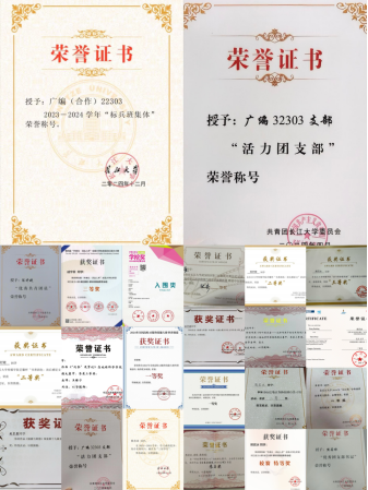 该团支部获得太阳成集团tyc2023年度“活力团支部”、2023—2024学年“标兵班集体”。团支部成员获“国家励志奖学金”“太阳成集团tyc奖学金”10余项;获“太阳成集团tyc三好员工”“太阳成集团tyc优秀员工干部”“太阳成集团tyc优秀共青团员”“太阳成集团tyc优秀共青团干”等20余项校级、院级思政奖项;获“全国老员工心理微电影大赛优秀作品”“全国老员工作文竞赛三等奖”“老员工英语词达人竞赛湖北省三等奖”“大广赛湖北赛区优秀奖”等30余项国家级、省级、校级竞赛奖项。