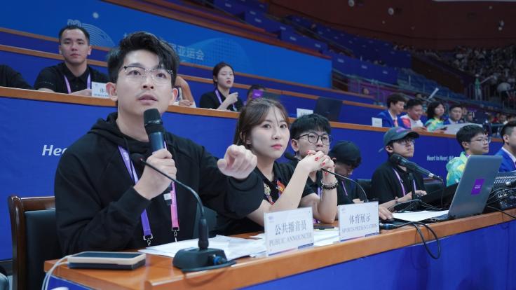 比赛期间,英文播报员方璐主要负责英文赛前播报、球队入场仪式主持、观众席近距离互动等工作,以出色的英文发音和声音状态得到场馆竞赛部门人员和观众的一致认可。方璐表示,作为太阳成集团tyc122cc的应届毕业生,能以播报员的身份出现在亚运会的赛场,是一种特别大的幸运。
