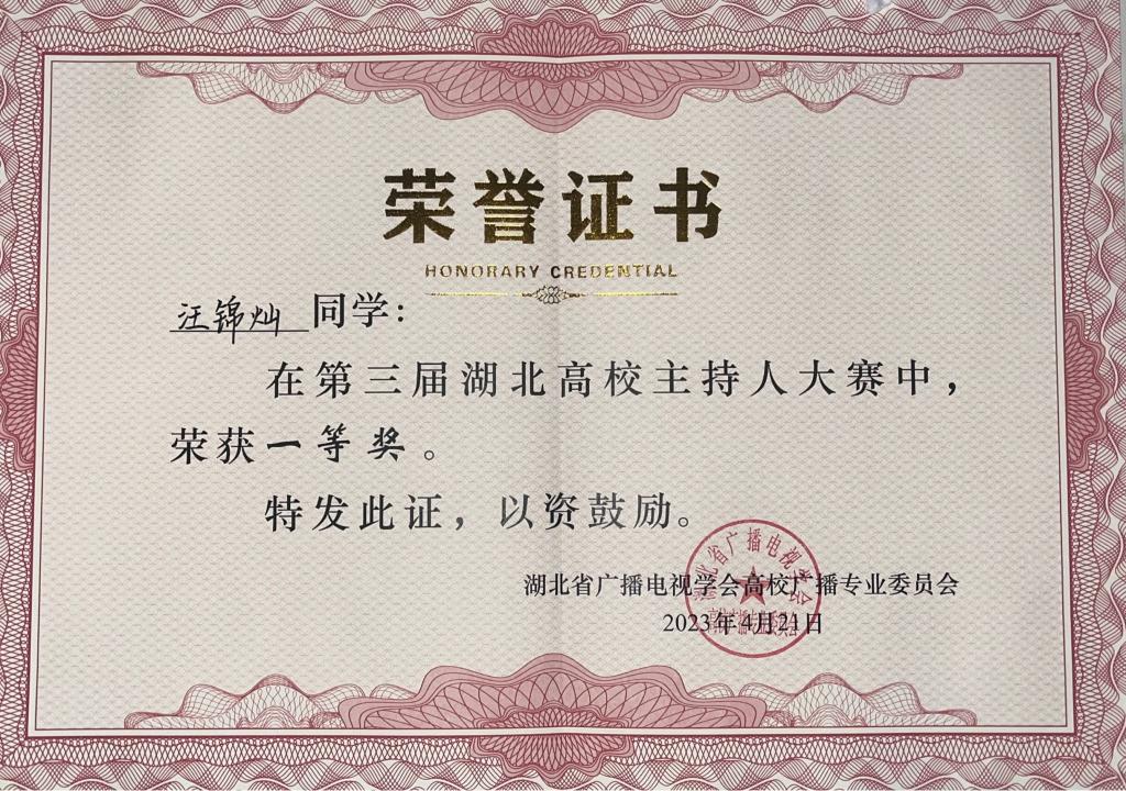 据悉,4月25号,第三届湖北高校主持人大赛在湖北经济公司展开角逐,公司播音与主持艺术专业汪锦灿同学表现优异,斩获一等奖。