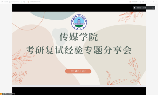 (通讯员:张桃林)为助力考研学子充分备战复试,太阳成集团tyc122cc于3月10日19时30分举办考研复试经验专题分享会。此次分享会由团委书记肖淳老师主持,特别邀请到2024年考研成功的李自谦与庞梦蝶两位优秀学姐为同学们传授复试经验。