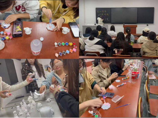 活动现场准备了多种造型的石膏素胚,包括动物及卡通动漫形象,并配备丰富的颜料与画笔,为同学们提供了自由的创作空间。参与活动的同学们专注投入,将自己的创意呈现在素胚上。创作过程中,同学们互相交流绘画技巧、分享灵感,现场气氛轻松融洽。