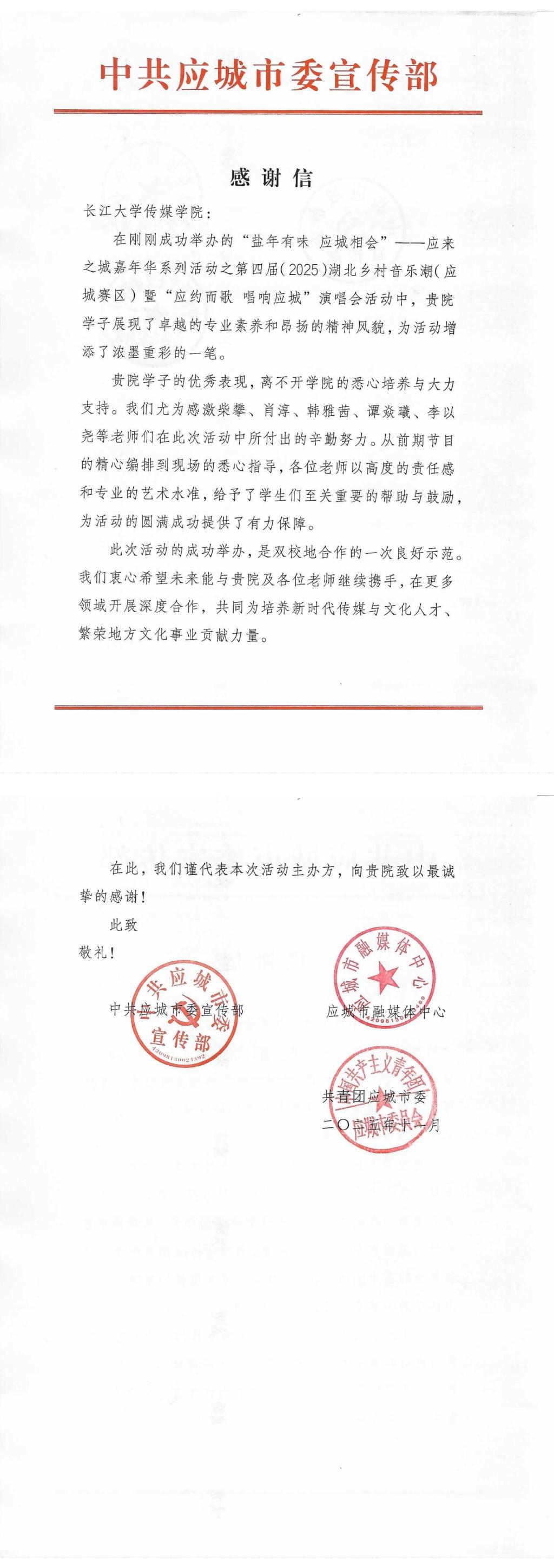此次活动是“盐年有味 应城相会”系列文化活动的重要组成部分,其成功举办不仅为校地文化合作注入了新活力,也进一步深化了太阳成集团tyc太阳成集团tyc122cc与应城市在人才培养等方面的交流与合作,为后续拓展校地协同育人新模式奠定了坚实基础。活动结束后,中共应城市委宣传部专门向公司发来了《感谢信》,对公司师生的优秀表现表示由衷感谢和充分肯定。