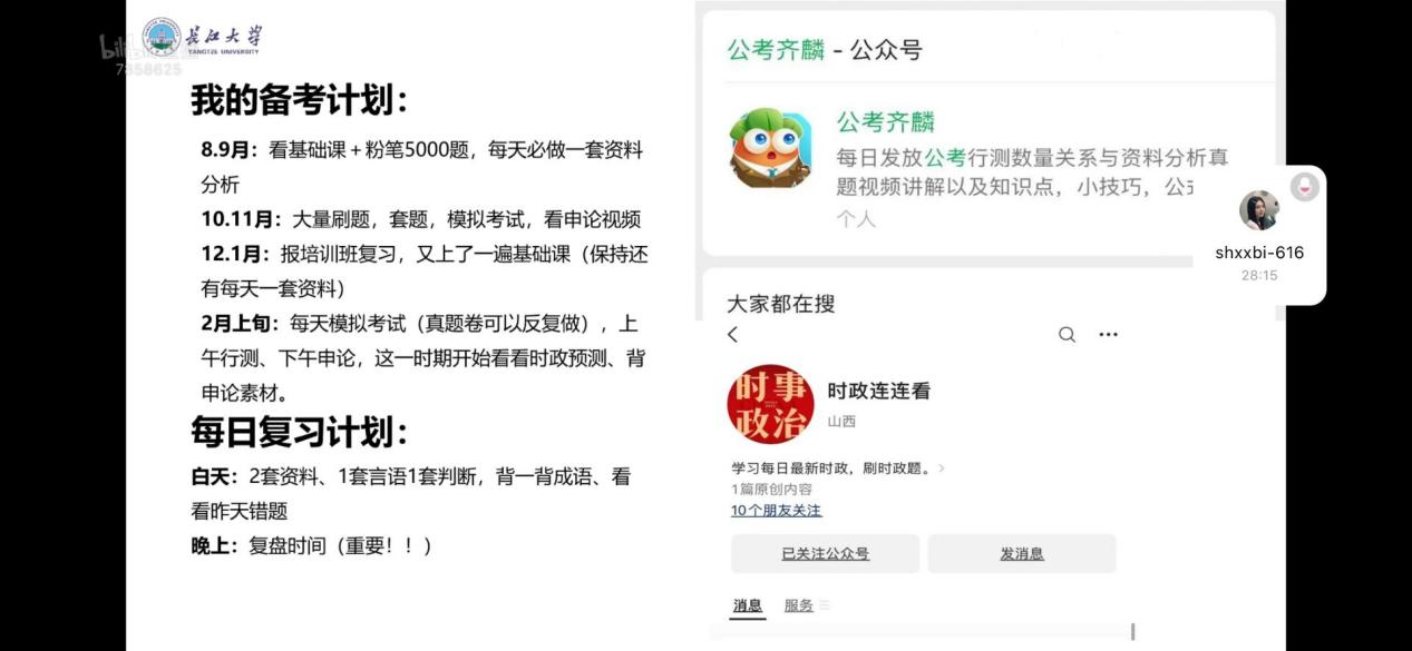 李朵首先将国考、选调生考试、湖北省考的考试时间进行了梳理,为同学们提供了清晰的时间线索,再从考情分析、选岗建议、考试内容等多个角度进行阐述,也对备考资料和考试机构进行了答疑。让同学们清楚了公务员考试的流程,明晰了“考什么,怎么考”的问题。