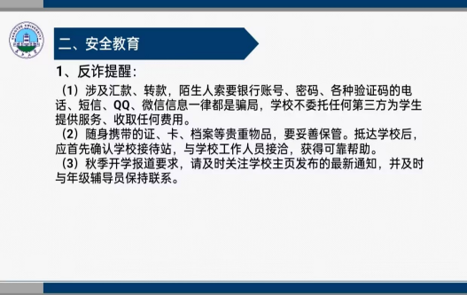 本次主题班会内容涵盖2023年秋季报道注意事项及开学安全教育。主要从开学报道相关流程、打卡、缴纳学费、提醒员工返校途中带好相关证件做好自我防护、防诈骗、宿舍用电防火安全等几个方面展开。