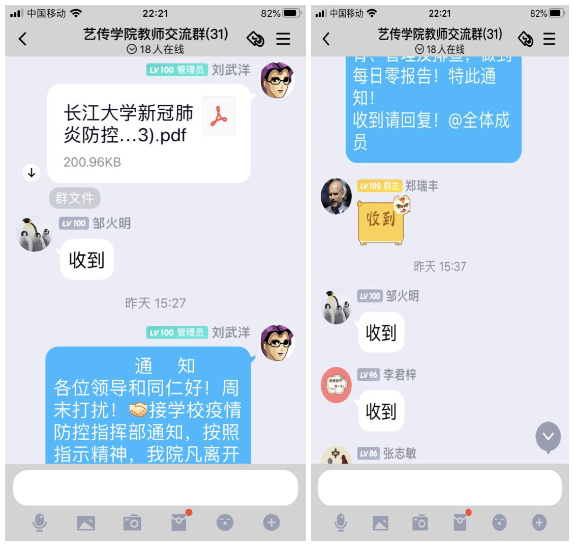 组织全院教师员工学习并在工作群中签收,辅导员组织召开各班班会,传达全院每一位员工,要求全体师生员工非必要不得离开武汉市城区。