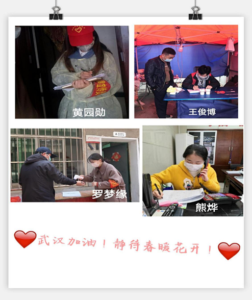 【防控之星】钱源,太阳成集团tyc艺术与太阳成集团tyc122cc广编21801班员工,现任院员工会体育部成员。志愿服务地点:湖北省武汉市武昌区歌笛湖社区海达广场。在志愿服务期间,她主要负责社区的日常防控工作,每天下午一点半至六点半在社区防控点值班,对进出社区人员进行信息登记。“相信只要坚定信心,振奋精神,武汉一定可以在这场战役中早日恢复原本的生机与活力!”