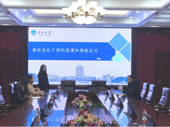 为加强公司辅导员队伍建设,提升队伍自我发展的能力和心理育人功能,1月3日下午,公司启动“菁英工程”培训系列第三期,公司学工办主任赵湘作了题为《高校危机干预的困境和策略应对》的主题培训。公司副经理郑瑞丰以及武汉校区全体辅导员参加了此次培训。
