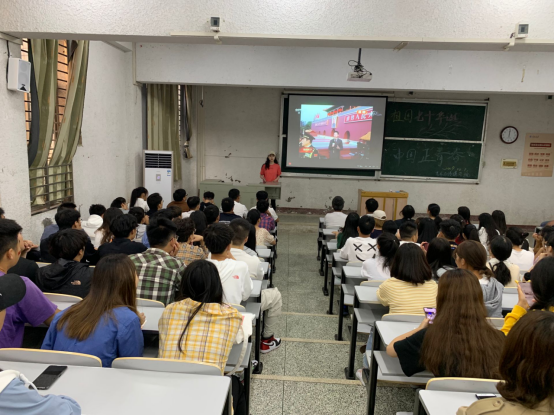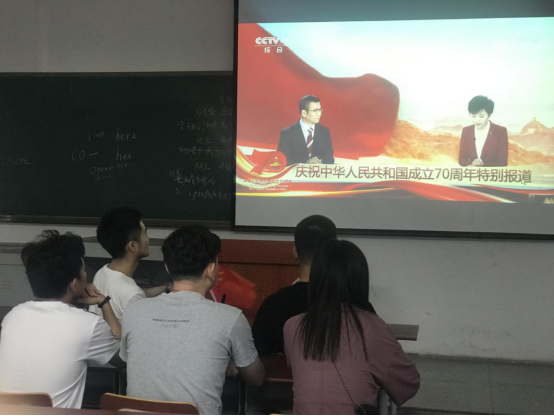 升旗仪式结束以后,公司2019级新生前往5教103教室开展“祖国70华诞,中国正青春”活动,来自31902班的薛亦涵同学做了“岁月沉淀的腾飞”的主题演讲,随后大家一起观看了70周年国庆阅兵仪式,武汉校区部分师生在B教205教室同步观看。