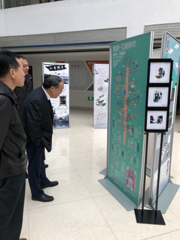 “徽派—石雕牌坊”展板前,谢董事长称道有底蕴、有个性;