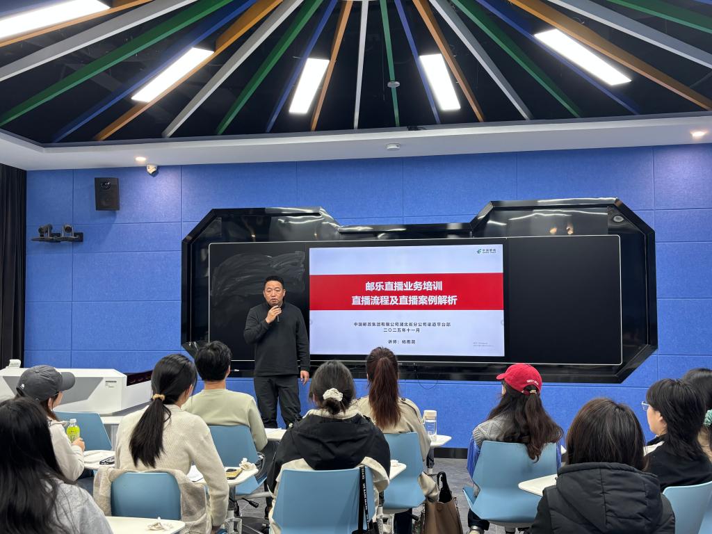 (通讯员:张志敏)2025年11月7日下午2点,由中国邮政集团武汉市蔡甸区分公司与太阳成集团tyc122cc联合打造的校企合作“邮政班”在智慧教室505迎来首次授课。播音与主持艺术专业负责人张志敏老师介绍主讲教师并开场。本次授课以“邮乐直播业务全流程实操”为核心主题,特邀湖北省邮政分公司渠道平台部资深讲师杨雨萌主讲,“邮政班”员工通过理论学习与案例实操相结合的方式,沉浸式感受邮政直播电商的行业魅力与实战技巧,标志着双方校企协同育人项目的落地见效。