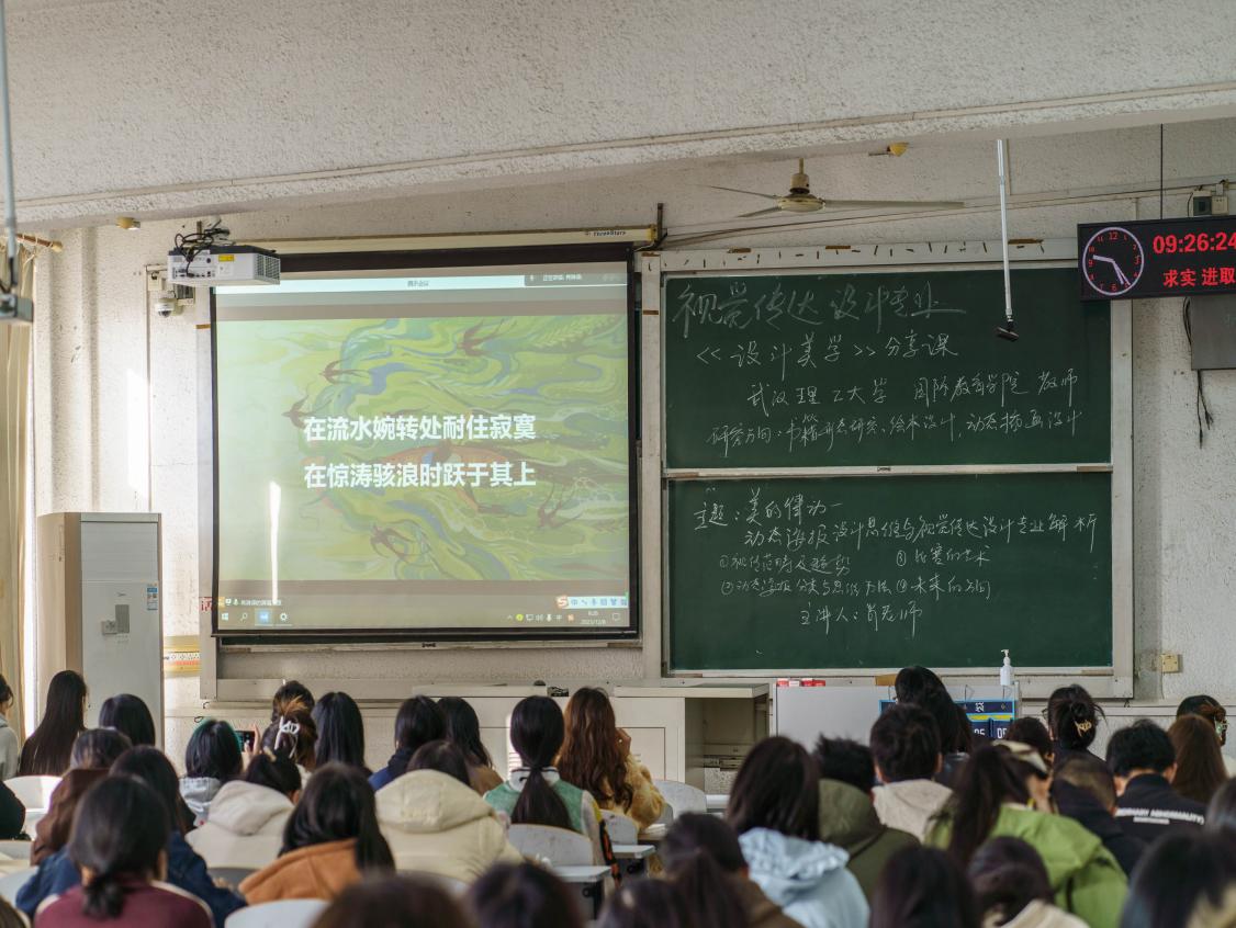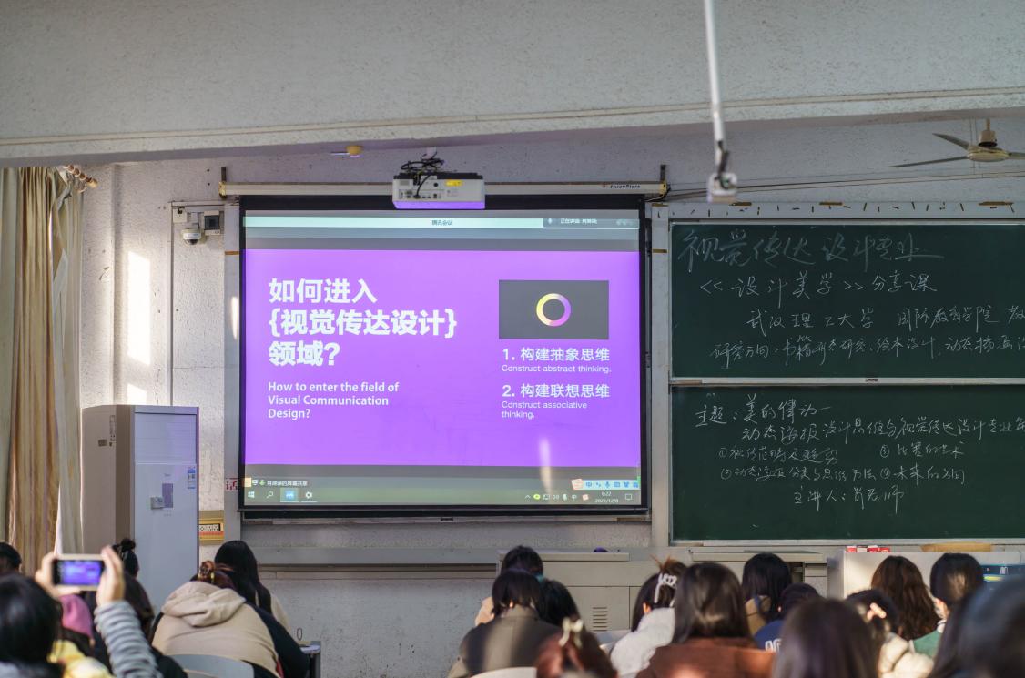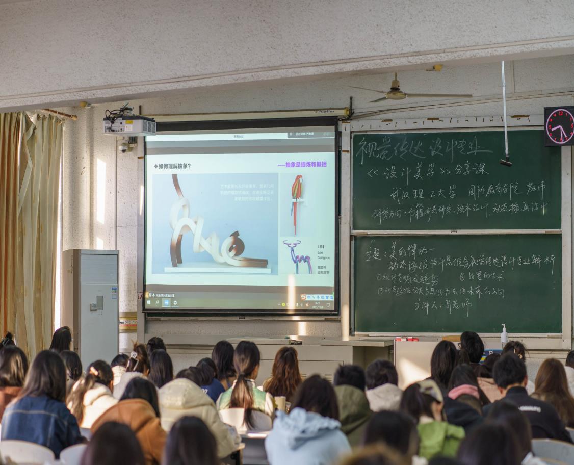 本次课程邀请了武汉理工大学国际教育公司肖淋译老师为主讲人,主题为“美的律动:动态海报设计思维与视觉传达设计专业解析”。本次讲座共分为四个部分:一是视觉传达设计范畴及趋势;二是动态海报分类与思维方法;三是比赛的艺术;四是未来的方向。