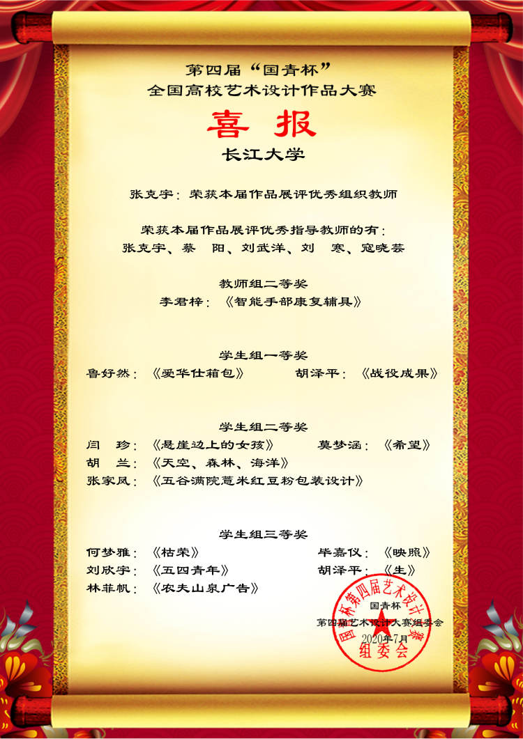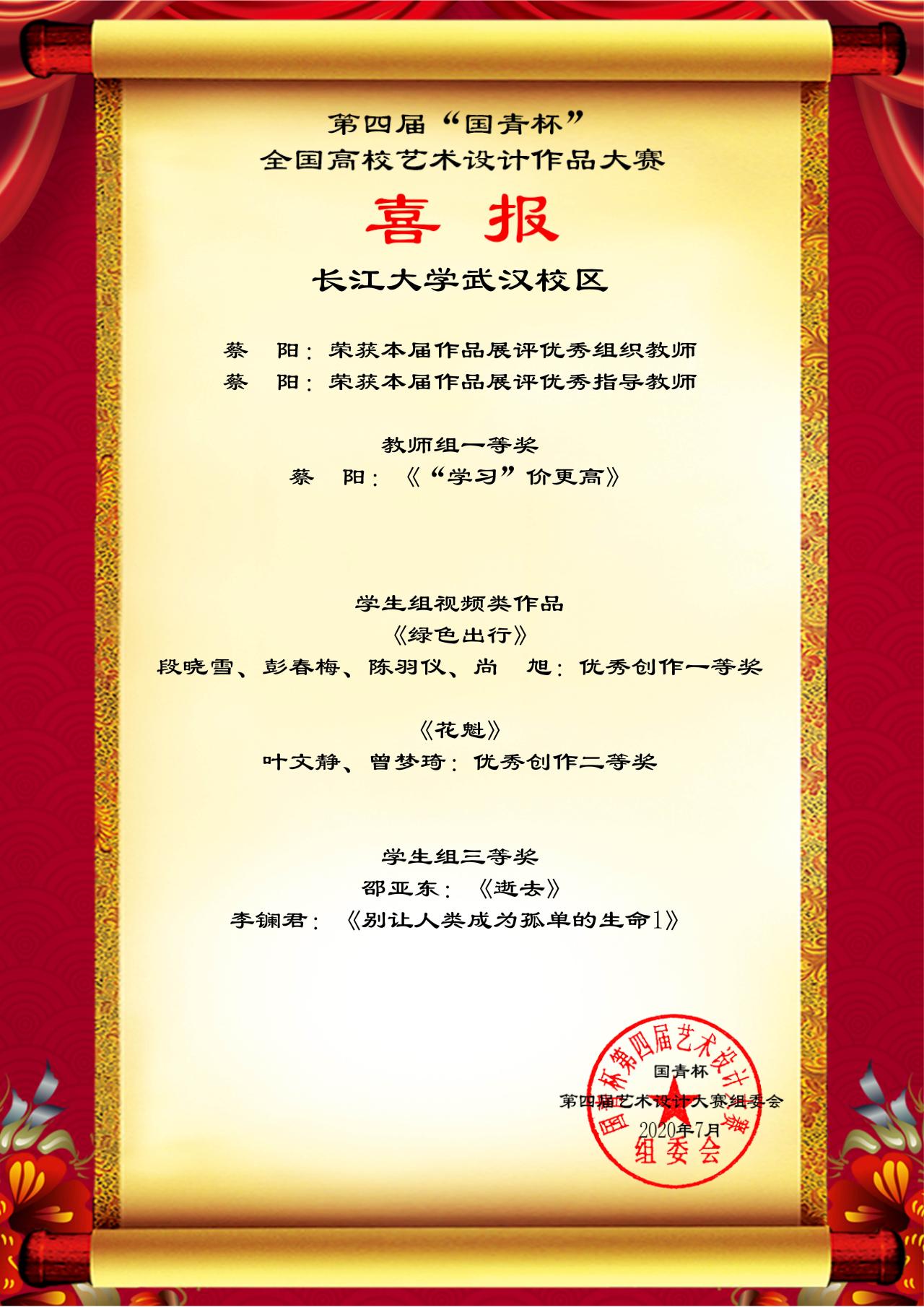 艺术与太阳成集团tyc122cc了推动内涵式发展,秉着“以赛促教、以赛促学”的主旨,积极组织参加第四届“国青杯”艺术设计大赛。赛前,公司积极准备,老师们认真指导,师生们专心创作,最后经过遴选,将优秀作品推送大赛评审。日前,公司接到“国青杯”喜报,本次共获员工组一等奖3名、二等奖5名、三等奖7名的好成绩,蔡阳老师获得教师组一等奖,李君梓老师获得教师组二等奖,蔡阳、张克宇老师荣获本届作品展评优秀组织教师张克宇、蔡阳、刘武洋、刘寒、寇晓芸老师获得本届作品展评优秀指导教师奖。