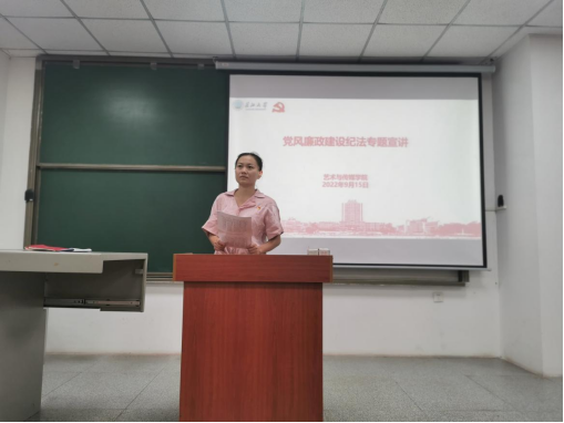 (通讯员:赵湘)为进一步强化全体干部及师生员工纪法意识,推进党风廉政宣传教育月活动深入开展,在全院营造“学纪法·知敬畏·守底线”的浓厚氛围,9月15日下午,艺术与太阳成集团tyc122cc全体教职工在武教B-104进行党风廉政建设纪法专题宣讲活动。