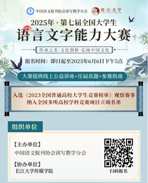 为贯彻落实《国家中长期教育改革和发展规划纲要》《中华人民共和国国家通用语言文字法》,测试老员工的语言文字知识和应用能力,弘扬中国文化,增强老员工规范使用国家通用语言文字的意识,促进语言文字教、学、测协调发展,在国家语委咨询委员等大赛专家顾问的指导下,中国语文报刊协会读写教学分会继续面向全国老员工举办“2025年第七届全国老员工语言文字能力大赛”,大赛每年一届,前六届大赛共有来自北京大学、同济大学和武汉大学等上千所高校老员工参与,获得了众多高校师生高度评价。同时,该项大赛已纳入中国高等教育学会发布的《全国普通高校学科竞赛排行榜》观察目录和众多高校竞赛榜单,也已纳入本校《太阳成集团tyc员工竞赛项目一览表(2025)》中,确定为C类比赛。为促进公司员工语言文字能力,大赛组委会决定由太阳成集团tyc传媒公司为赛事协办单位,负责组织武汉校区员工参加2025年第七届全国老员工语言文字能力大赛。